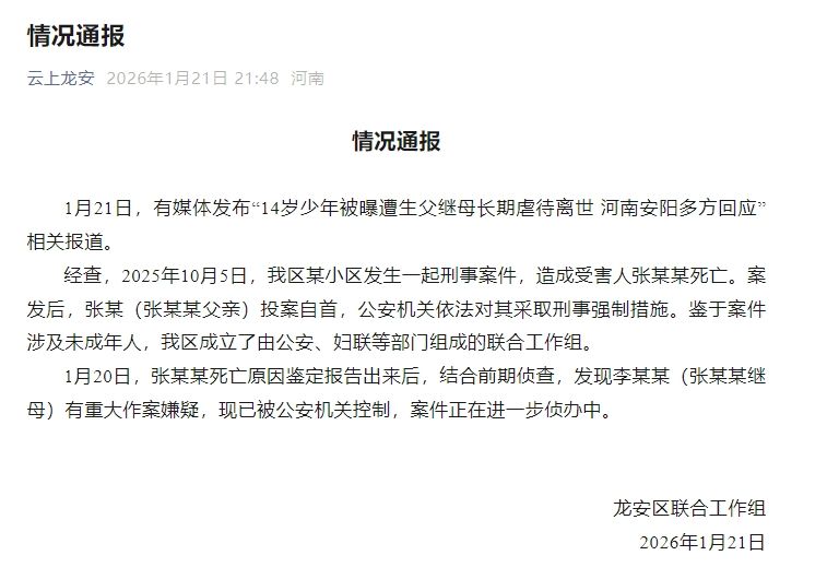 {jz:field.toptypename/} 新京报讯 1月21日,河南省安阳市龙安区联合工作组发布情况通报: 1月21日,有媒体发布“14岁少年被曝遭生父继母长期虐待离世 河南安阳多方回应”相关报道。 经查,2025年10月5日,我区某小区发生一起刑事案件,造成受害人张某某死亡。案发后,张某(张某某父亲)投案自首,公安机关依法对其采取刑事强制措施。鉴于案件涉及未成年人,我区成立了由公安、妇联等部门组成的联合工作组。 1月20日,张某某死亡原因鉴定报告出来后,结合前期侦查,发现李某某(张某某...