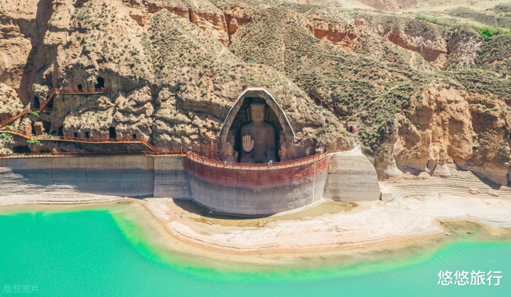 天梯山石窟嵌在山崖间,大佛直面黄羊水库,自带一种静谧的美感。