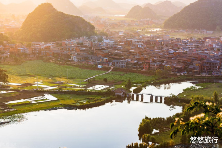 清晨,薄雾在峰林间、湖面上袅袅升起,村庄若隐若现。乘一艘小船穿梭在荷塘中,感受微风拂面,静享彝族村落的落日晚霞。