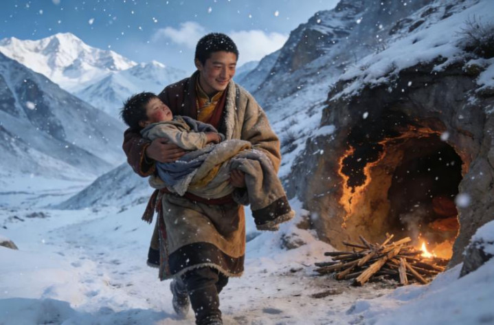 扎西师父的声音变得柔和:" 那是一个冬天,格莫路过这片山谷,看见雪地里躺着一个小男孩。孩子已经快不行了,浑身发紫,气若游丝。"
