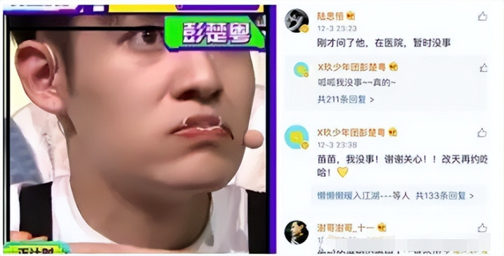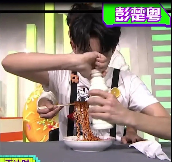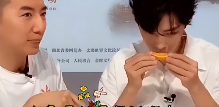拿顶流肖战举例,未成名之前和组合一起上综艺,彭楚粤和肖战一起表演挑战吃火鸡面。彭楚越非常配合开吃,因为太辣了他还喝了旁边的牛奶。