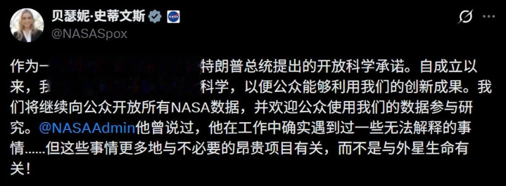 20 日,NASA 发言东谈主贝瑟尼·史蒂文斯(Bethany Stevens)在 X 平台复兴称:“咱们不息拥护总统在洞开科学方面的容许……咱们将不息公开总共 NASA 数据,并接待公众使用这些数据参与洽商。”她还幽默补充,NASA 遭遇的“无法讲解的事物”频频是形式严重超支,而非外星人命。