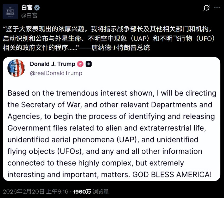 同日,特朗普在 Truth Social 平台慎重发帖文牍:“基于公众发达出的重大兴味,我将相通国防部长和其他关联部门及机构,全面识别并公开与外星人命、不解空中征象(UAP)、不解翱游物(UFO)以及任何与之关联的总共信息的政府文献。”白宫官方账号随后完好意思转发了这一声明。