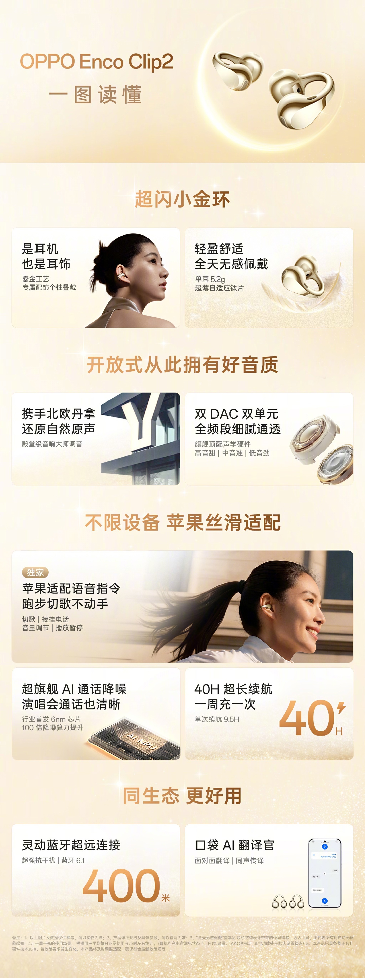 30、OPPO Enco Clip2 耳夹耳机规格公布:苹果适配语音指示,40 小时续航新品将于 4 月 21 日发布,取舍鎏金工艺,单耳仅 5.2g。最大亮点是独家适配苹果语音指示,维捏切歌、通话等操作,并领有 40 小时超长续航和 AI 通话降噪。