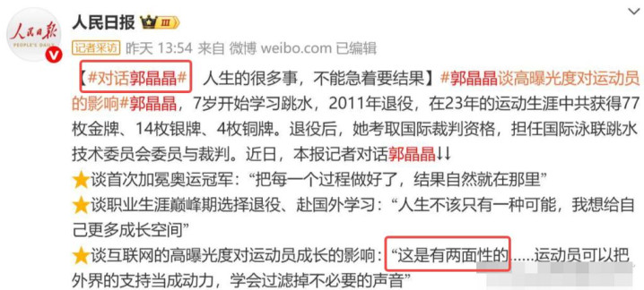 前年10月份,她在承袭东谈主民日报的专访时,便坦言畅通员过度曝光的两面性。