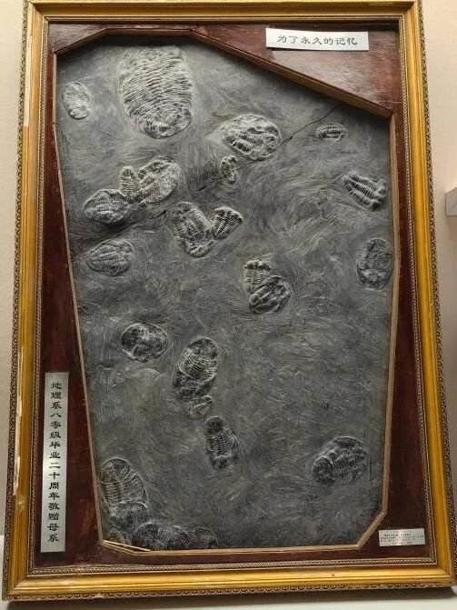 1980级地理系学生捐赠了一块三叶虫化石版。这版化石来自湘西,记录了地球上寒武纪生命大爆发不久的生物图景,具有极高的科学价值(下方左图,现放置于地质标本馆捐赠区)。