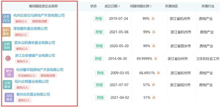 其次,众安集团旗下的多个公司出现了被现实东说念主。举例杭州众安昌盛城市发展有限公司、无锡众安房地产开荒有限公司、杭州众安白马房地产开荒有限公司等。