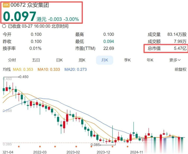 同期,也让众安的股价一跌再跌,驱逐到3月29日,众安集团的股价为0.097港元,总市值约为5.47亿。